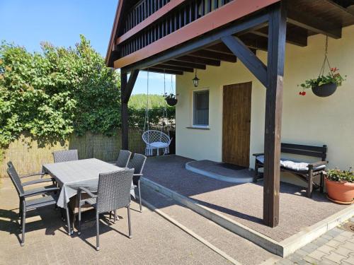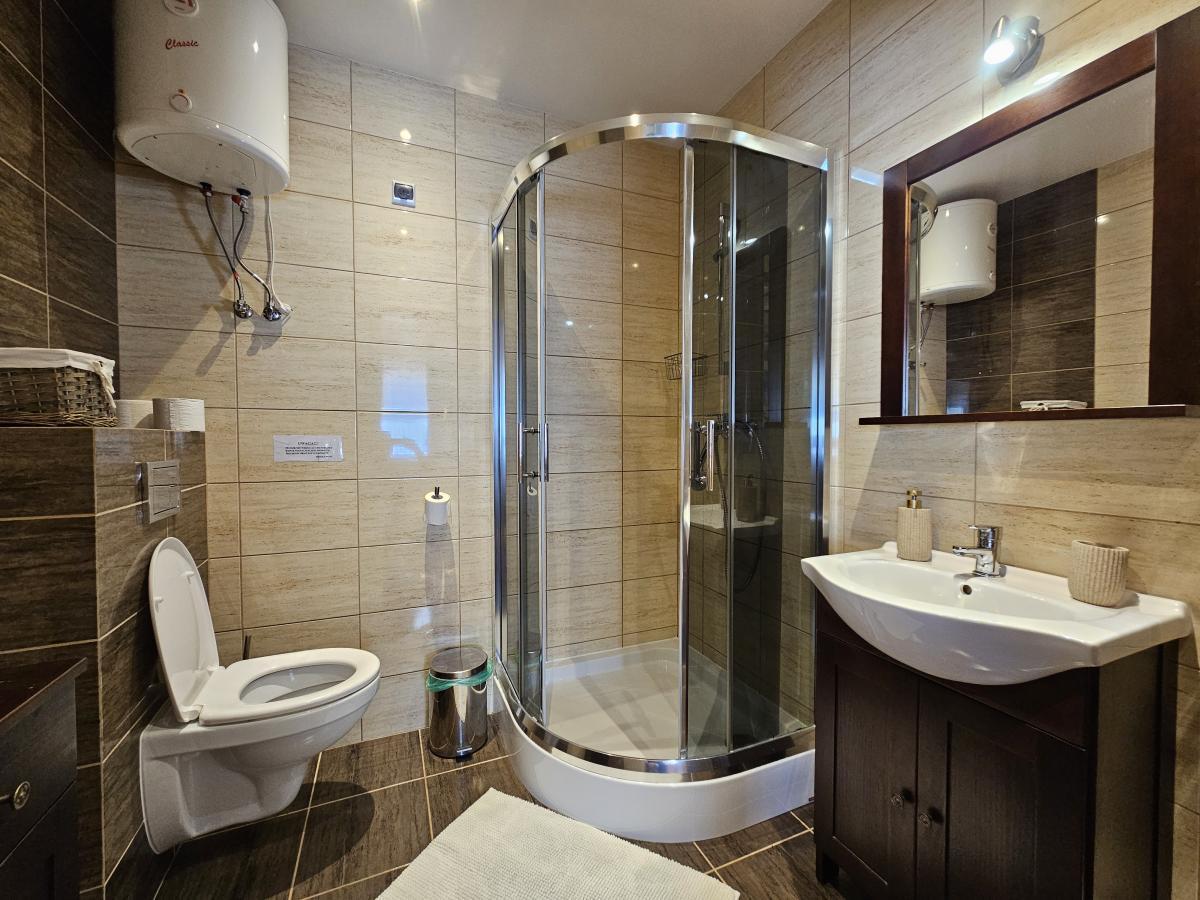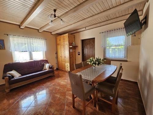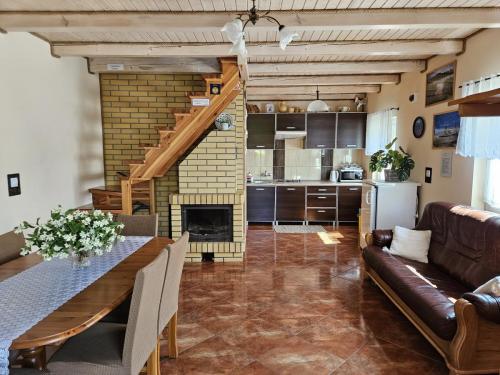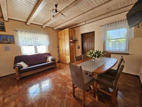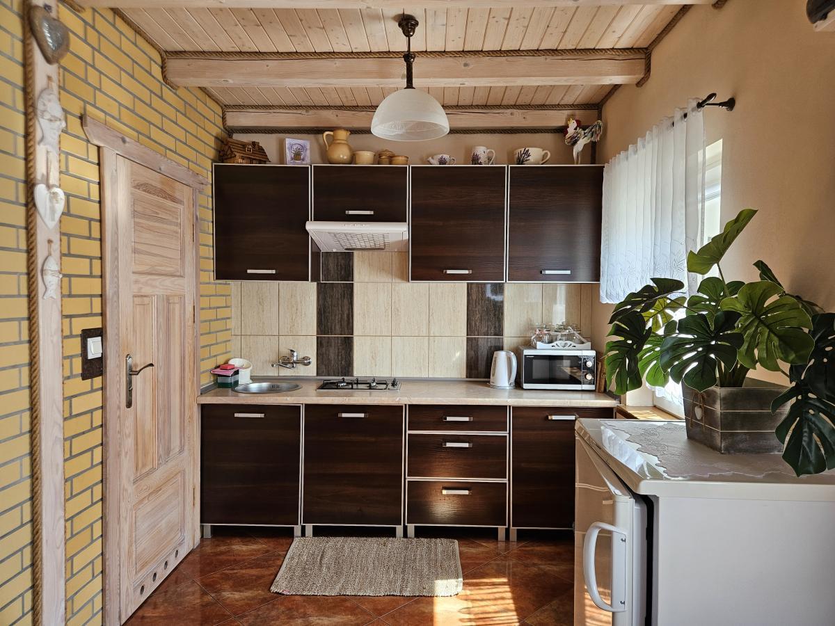 Parter: -Salon z aneksem kuchennym i jadalnią, -Kuchnia w pełni wyposażona „płyta gazowa, garnki, naczynia itp”, -Rozkładana kanapa, -Taras wypoczynkowy.