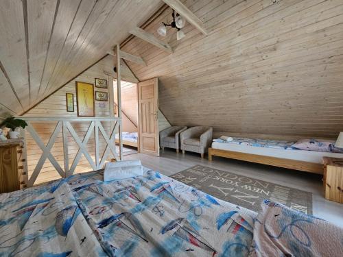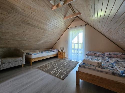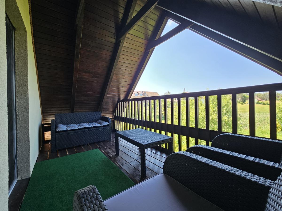 Piętro: -2 sypialnie 3 osobowe (w każdym z pokojów łóżko małżeńskie oraz łóżko pojedyncze), -Taras z meblami wypoczynkowymi.